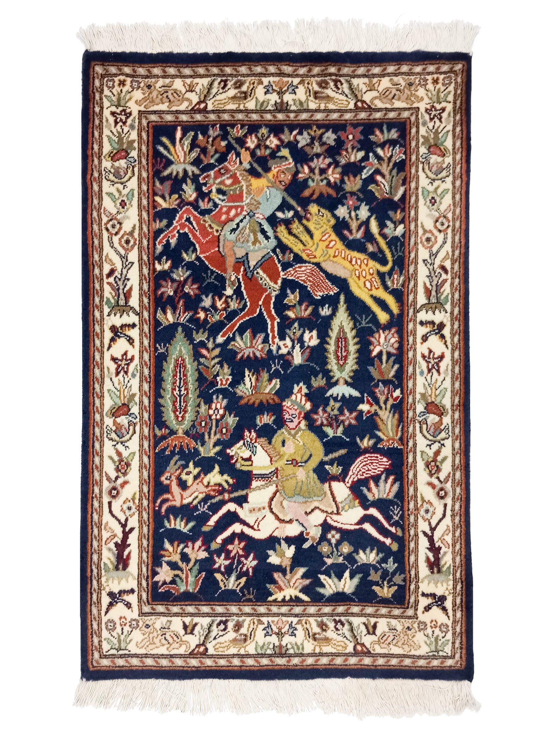 Add timeless charm to your home with our Double Knot Collection. Expertly hand-knotted by master artisans, each rug showcases the precision and durability of the double knot technique — a hallmark of traditional weaving excellence. Featuring the historic Shikarga design, known for its depiction of royal hunting scenes, this rug carries a legacy of power, prestige, and artistic storytelling.